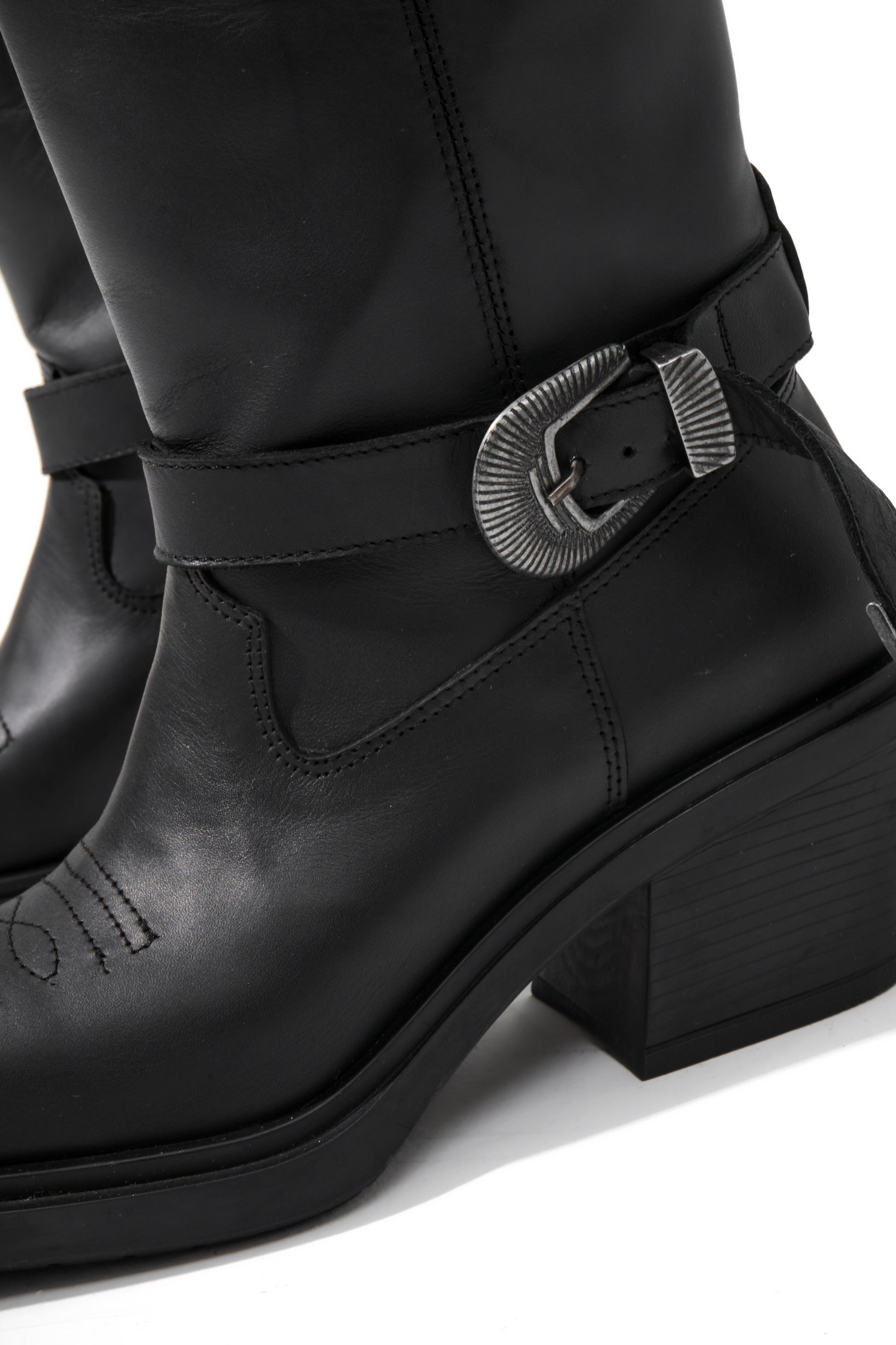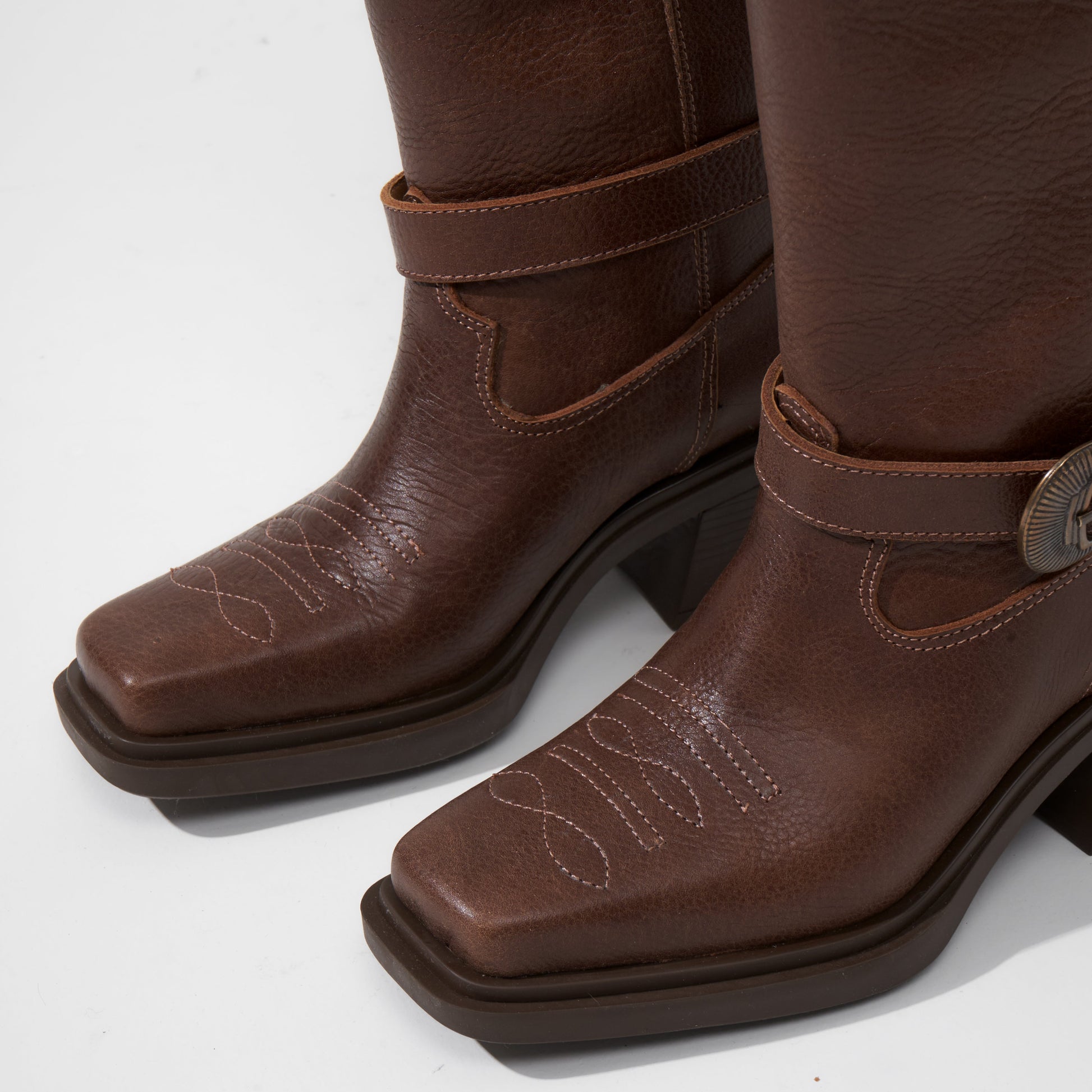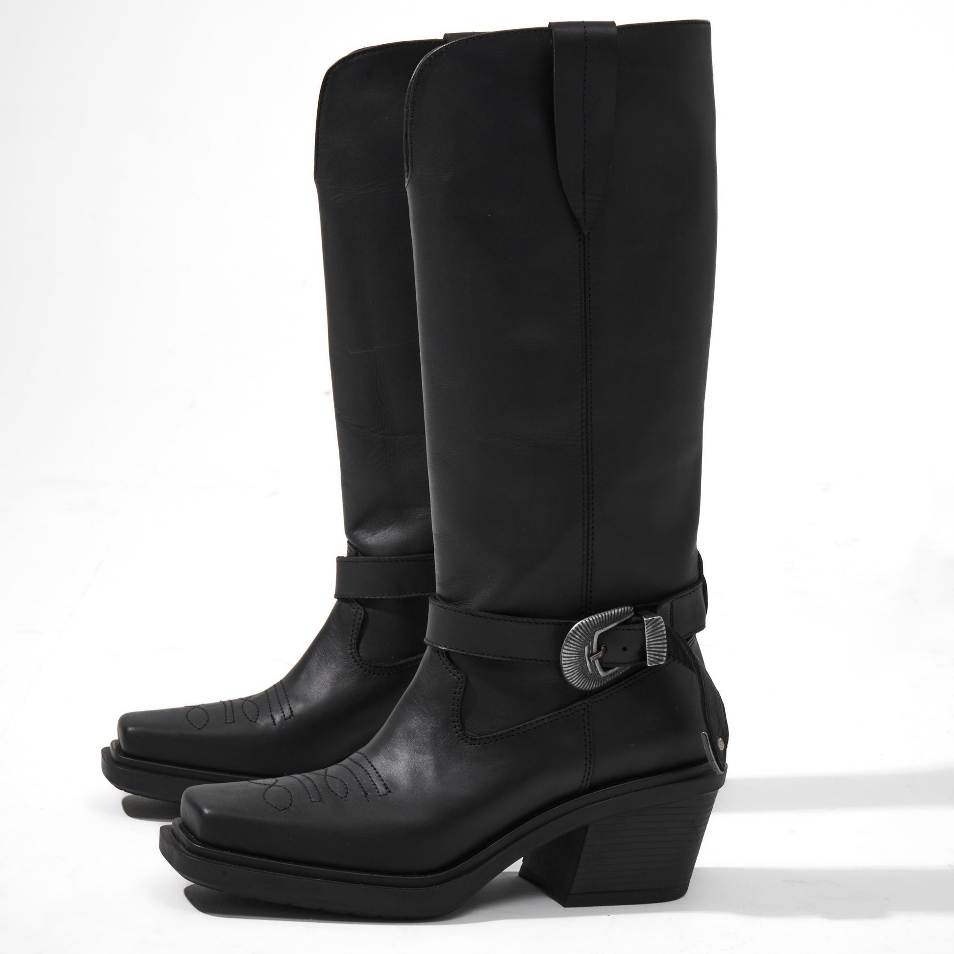 Confeccionadas en cuero Vacuno de alta calidad con detalles de bordado y correa desmontable. Cuenta con una elegante punta cuadrada, caña alta de 30 cm y base artesanal con un taco de 6 cm.